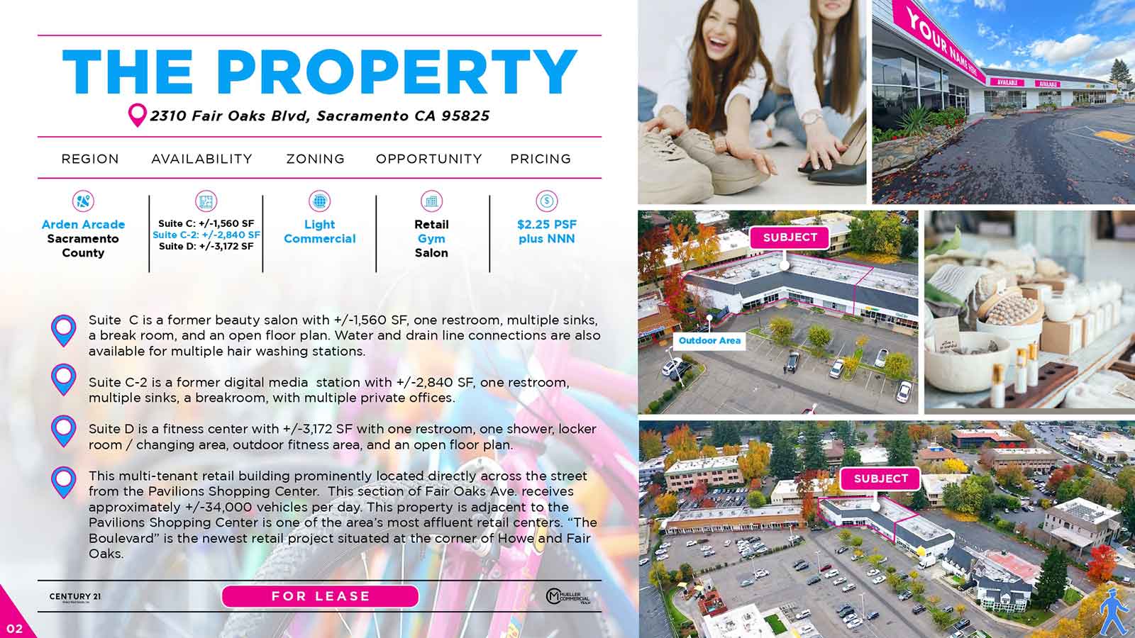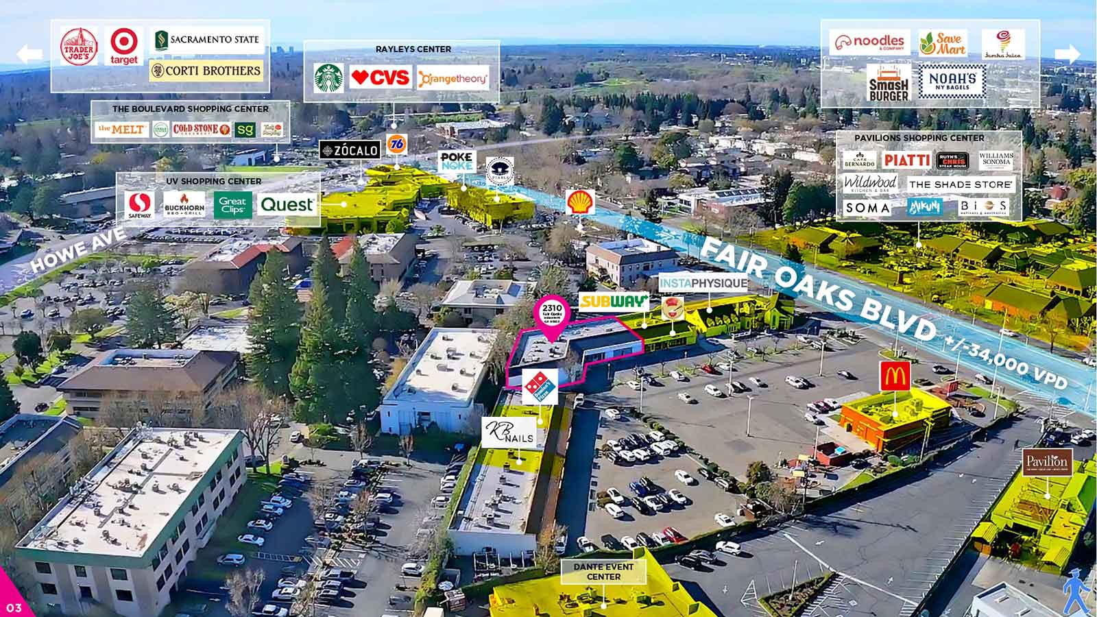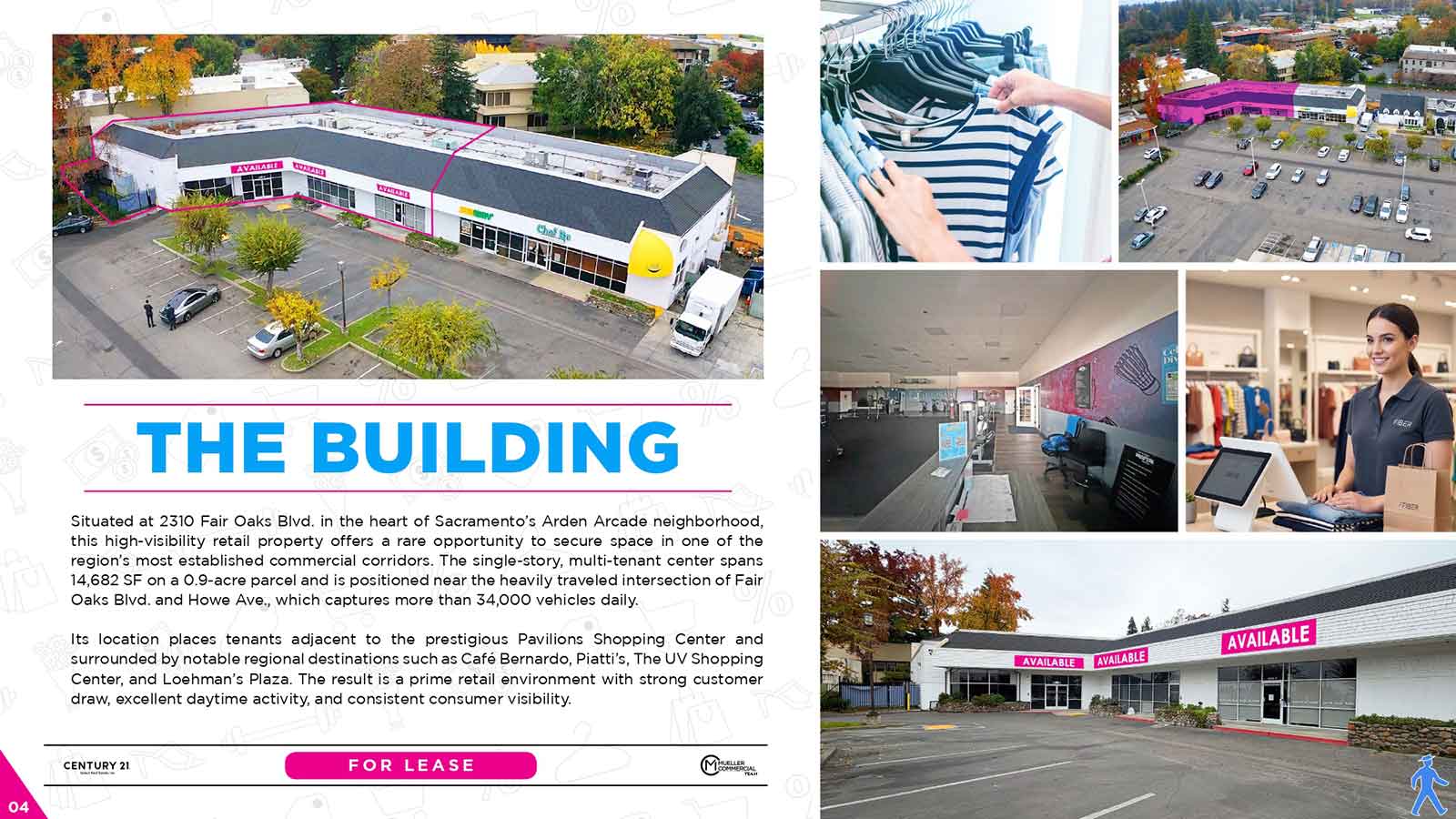 Situated at 2310 Fair Oaks Blvd. in the heart of Sacramento’s Arden Arcade neighborhood, this high-visibility retail property offers a rare opportunity to secure space in one of the region’s most established commercial corridors. The single-story, multi-tenant center spans 14,682 SF on a 0.9-acre parcel and is positioned near the heavily traveled intersection of Fair Oaks Blvd. and Howe Ave., which captures more than 34,000 vehicles daily.