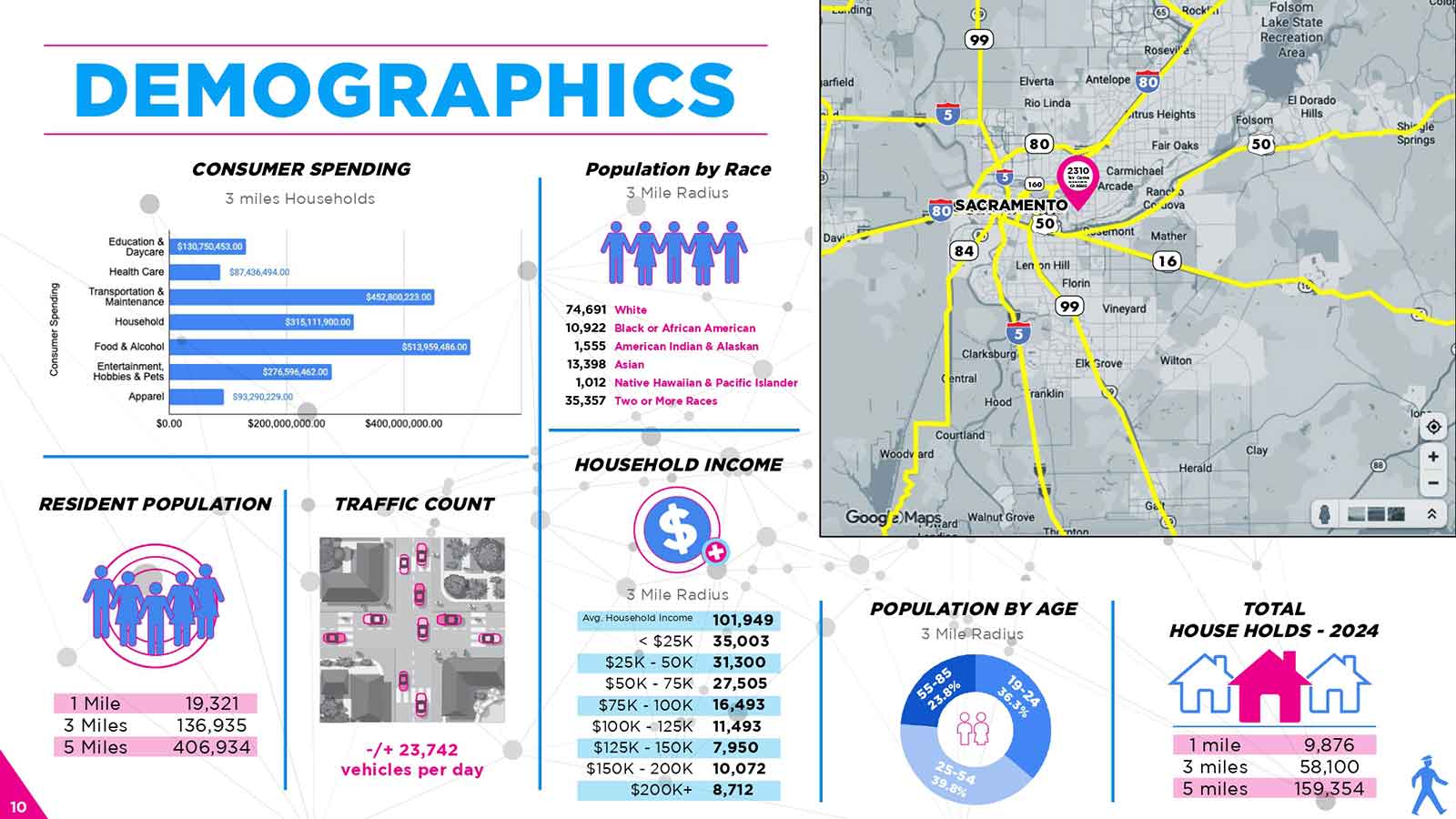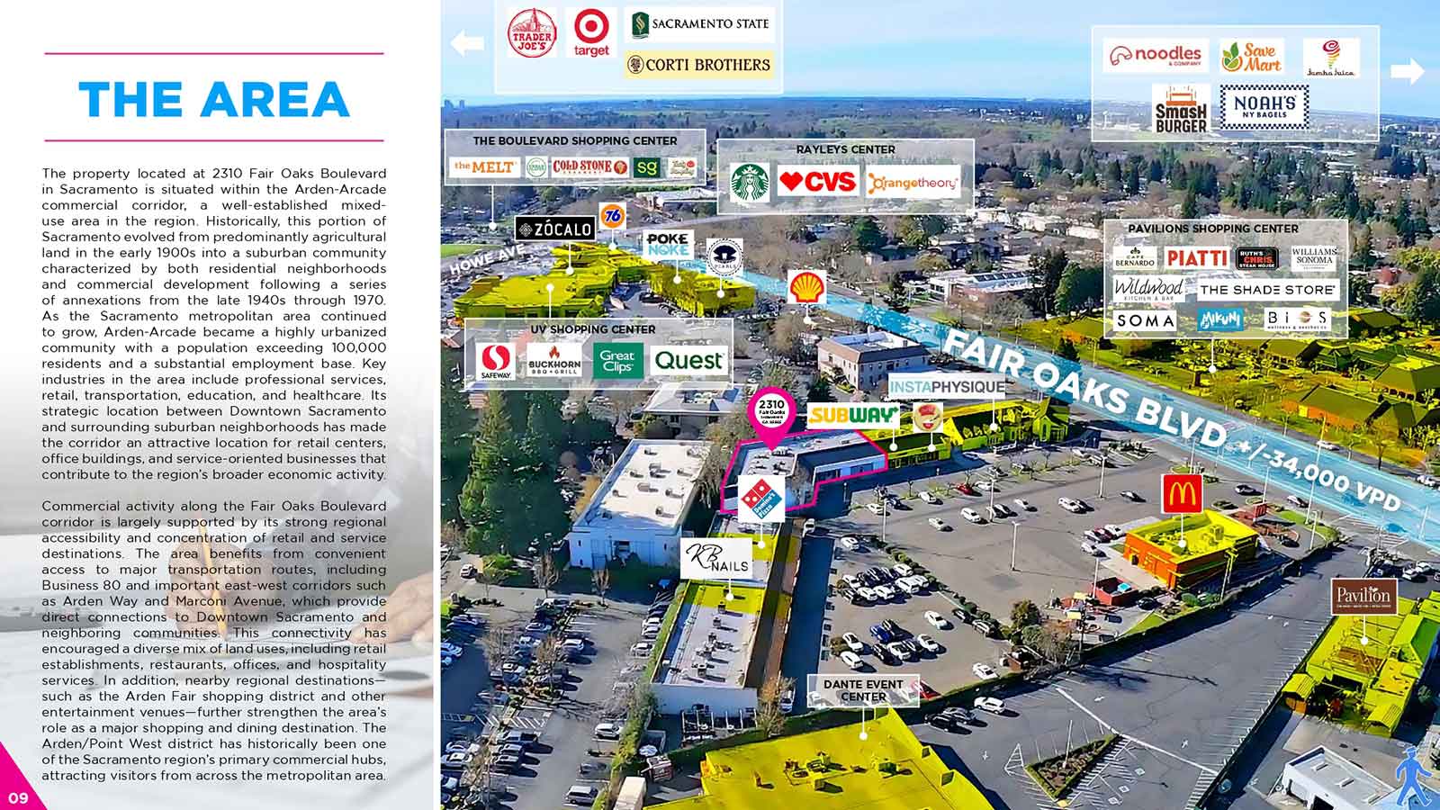The property located at 2310 Fair Oaks Boulevard in Sacramento is situated within the Arden-Arcade commercial corridor, a well-established mixed- use area in the region. Historically, this portion of Sacramento evolved from predominantly agricultural land in the early 1900s into a suburban community characterized by both residential neighborhoods and commercial development following a series of annexations from the late 1940s through 1970. As the Sacramento metropolitan area continued to grow, Arden-Arcade became a highly urbanized community with a population exceeding 100,000 residents and a substantial employment base. Key industries in the area include professional services, retail, transportation, education, and healthcare. Its strategic location between Downtown Sacramento and surrounding suburban neighborhoods has made the corridor an attractive location for retail centers, office buildings, and service-oriented businesses that contribute to the region’s broader economic activity.
