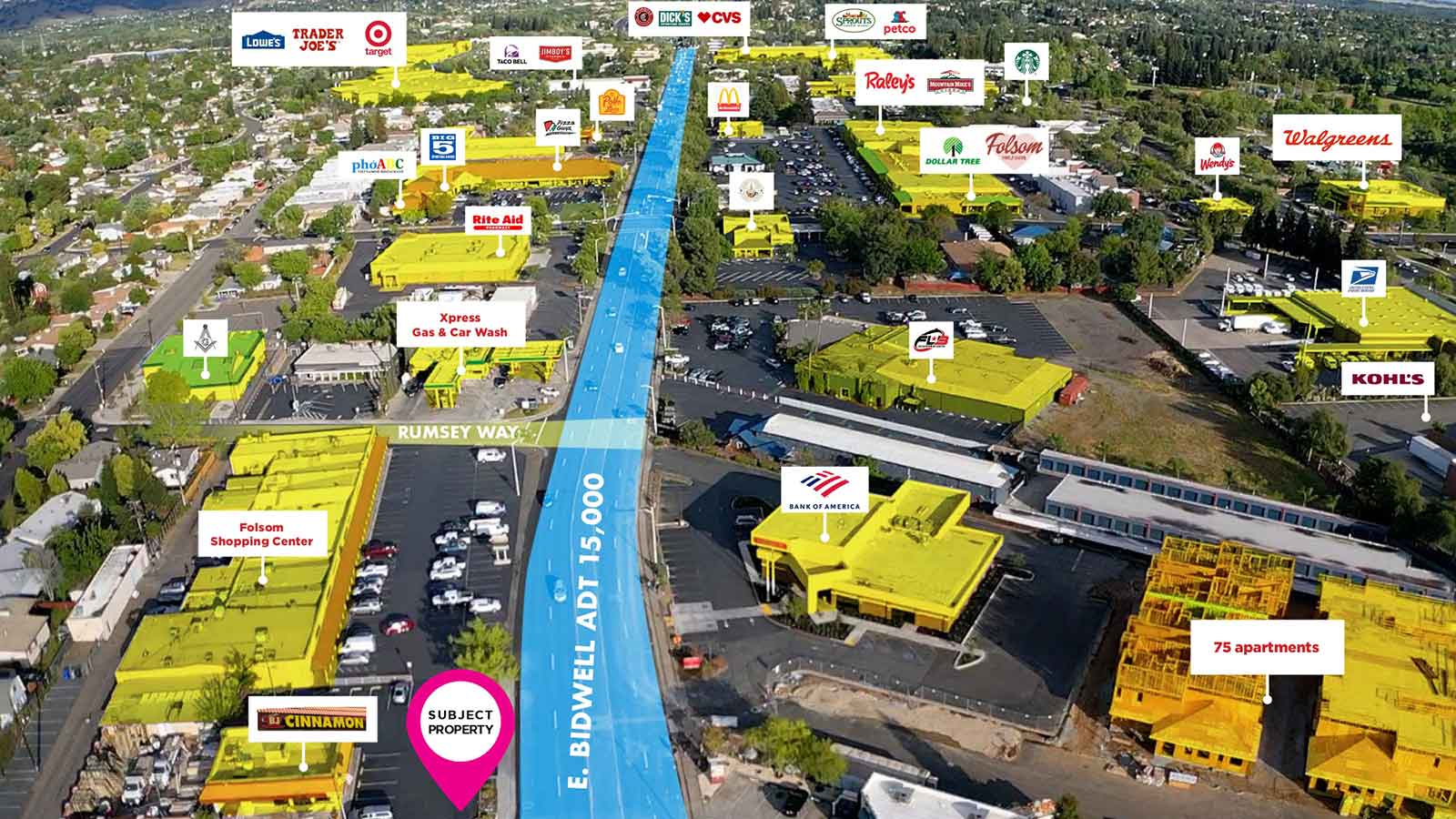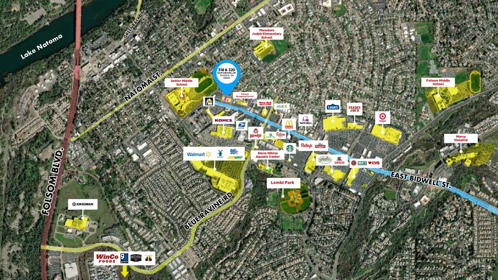 The subject building is highly visible on E Bidwell St which is walking distance from Sutter Middle School and other national retailers. The premises benefits from the highly traveled street from students and the several national retailers that sur-round the building. E Bidwell St. acts as a main arterial street that ends at HWY 50.