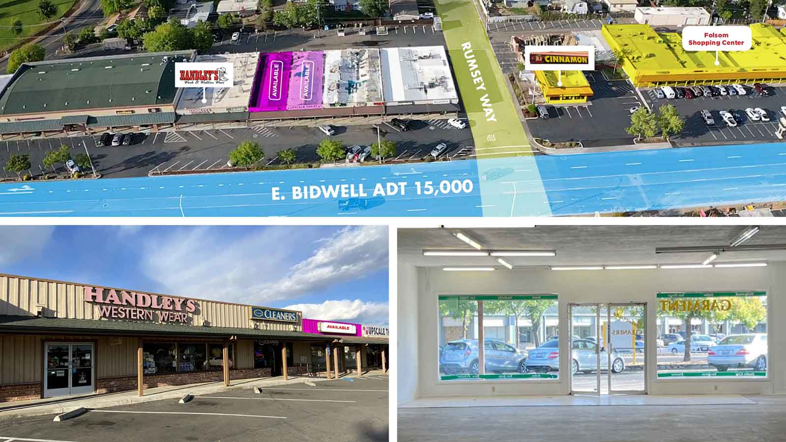 The subject building is located on the north-ern side of E Bidwell St. in Folsom, CA where is sees an average daily traffic count of 15,000 vehicles per day. The parcel sits adjacent to Sutter Middle School and is located directly across the street from the Folsom Lake Shop-ping Center with The Cave Record store and the Folsom DMV. E Bidwell is one of the main arterial streets that begins near Folsom Blvd. and ends at HWY 50. Quick Dish, a Brazilian -American fusion cuisine and Sherwin Williams Paint store occupy suites within the same center as the +1-2,700 sf vacancy. The suite is a former dry cleaner and has the convivence of having a roll-up door located in the rear of the premises.